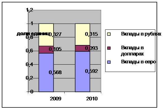 В результате опережающих темпов прироста остатков на рублевых счетах частных вкладчиков Банка за 2010 год (27,0%) по сравнению с остатками вкладов в иностранной валюте (18,1%) удельный вес рублевых вкладов в общем остатке вкладов физических лиц Банка впервые за последние четыре года превысил 80%. В то же время ускоренный прирост остатков вкладов в евро (56,8% за год) по сравнению с остатками вкладов в долларах США (10,5% за год) привел к увеличению удельного веса вкладов в евро в общем остатке валютных вкладов физических лиц, хранящихся в Сбербанке России, с 12,7 до 18,3%.