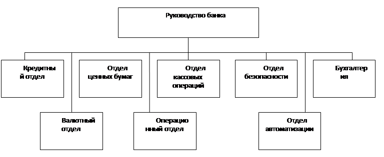 представленная на рис.3, является наиболее распространенной схемой организационного построения коммерческого банка, главным образом, небольших и средних размеров. Она строится на основе пооперационного разделения подразделений. Ее типичные составляющие - валютный, кредитный и операционный отделы. Отличительными чертами такой структуры являются жесткое разделение обязанностей и характерный для государственных учреждений бюрократический дух.