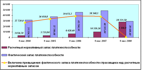 Фактический запас платежеспособности компании за отчетный период превысил нормативный показатель на 35 млн. 741 тыс. грн. и составил 48 млн. 97 тыс. грн. По сравнению с 2006 годом запас платежеспособности ЗАО ФГ «Страховые традиции» увеличился на 1,2 % (рис. 3).