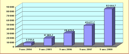 ЗАО ФГ «Страховые традиции» в 2007 г. собрала страховых платежей на сумму 76 млн. 616 тыс. грн. Этот показатель больше чем в 2006 г. на 28 млн. 904 тыс. грн. Наибольший рост платежей отмечен в сферах страхования автотранспорта и ответственности – на 181, 6 % и 335 % соответственно. Динамика роста поступлений страховых премий ЗАО ФГ «Страховые традиции» показана на рис. 4. В 2007 году сумма выплат страховых возмещений ЗАО ФГ «Страховые традиции» составила 17 млн. 776 тыс. грн., что на 9 млн. 928 тыс. грн. (126%) превышает аналогичный показатель 2006 года.