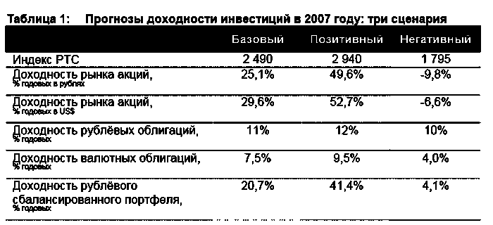 За два последних года российские акции в среднем подорожали втрое, а за 6 лет – в 13 раз. Это лучшие показатели среди всех мировых рынков. После столь длительного и впечатляющего роста у многих инвесторов появляются сомнения в дальнейшей позитивной динамике рынка. К тому же, два из ключевых факторов формирования этой доходности – растущие цены на нефть и политическая стабильность – могут в 2007 году заметно ослабить своё влияние. Тем не менее, всё ещё низкая оценка российских сырьевых активов и высокие темпы роста прибылей в несырьевых отраслях создают предпосылки для продолжения роста котировок. По базовому сценарию он может составить 25-30%, по оптимистичному – до 50%. В отсутствие существенного роста цен на нефть, наиболее высокие результаты покажут акции «второго эшелона».