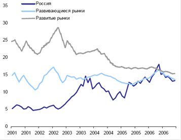 С 2001 года среднее соотношение цена/прибыль по российским акциям выросло почти втрое. Этот скачок выглядит ещё более впечатляющим, на фоне стагнации того же коэффициента по бумагам других развивающихся стран и его резкого снижения по акциям развитых рынков. В результате дисконт российских бумаг по текущему P/E почти исчез. Это ставит наш рынок в сильную зависимость от будущих темпов роста прибылей эмитентов и динамики мировых фондовых площадок.