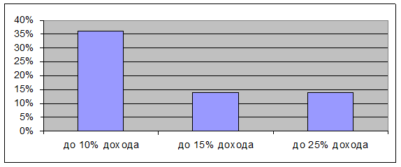 Опросы показывают, что каждый четвертый россиянин пользовался кредитами за последний год для приобретения различных товаров. На погашение кредита треть заемщиков (36%) тратят до 10% своего среднемесячного дохода, 14% заемщиков на погашение долга тратят до 15% дохода, еще 14% опрошенных ежемесячно отдают банку в счет погашения кредита до 25% своего дохода (рисунок 1).