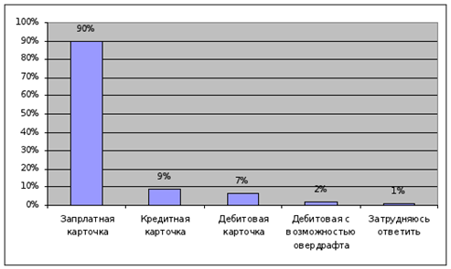 Каждый десятый россиянин, пользующийся пластиковыми карточками, сообщил, что имеет в своем распоряжении кредитную карту. 7% опрошенных являются держателями дебетовой карточки без овердрафта и 2% - дебетовой карточки с овердрафтом.