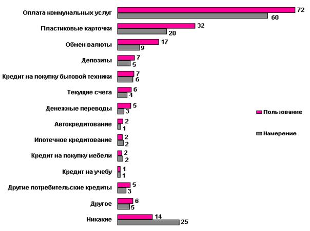 Большинство держателей пользуются только одной платежной картой. Об этом сообщили 85% опрошенных. Каждый десятый держатель (12%) использует две карточки. У 2 % опрошенных в обращении находиться три карточки, и у 1% - четыре или пять банковских карточек. Структура держателей карточек по количеству карточек в обращении представлена на рисунке 6.