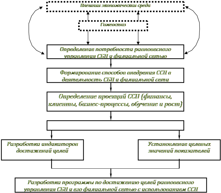 Внедрение ССП в деятельность коммерческого банка обусловлена необходимостью равновесного управления процессами развития филиальной сети, что в условиях экономического кризиса неизбежно вследствие банкротства региональных банков. В связи с тем, что локальный спрос на банковские продукты сохраняется, оставшиеся банки занимают высвобождающийся сегмент банковского рынка. Поэтому в рамках реализации задачи равновесного управления были выделены следующие этапы формирования ССП для субъекта банковского предпринимательства с развивающейся филиальной сетью: