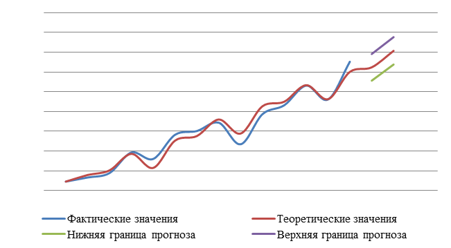 Рис. 7. Поквартальная динамика фактических и прогнозируемых объемов выданных ипотечных кредитов по Новосибирской области (млн. руб.)
