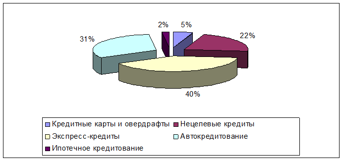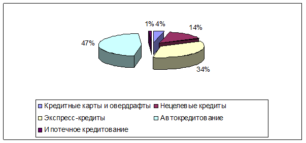 Так, на начало 2008 года в структуре потребительского кредитного портфеля ЗАО «ВТБ-24» преобладали экспресс-кредиты – 40 %, а на конец 2008 году в структуре потребительского кредитного портфеля наибольшую долю стали занимать автокредиты.
