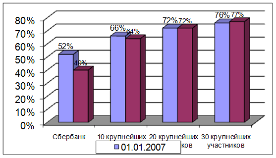 Темпы прироста активов банковского сектора России превышают темпы прироста капитала в пропорции 36,6% к 31,2%. Еще быстрее, чем капитал и активы, продолжают увеличиваться и объемы кредитования — 40,3%, что свидетельствует о том, что одновременно с повышением доходов от операций кредитования банковская система принимает на себя все большие риски. Учитывая, что большая часть роста пришлась на кредиты физическим лицам — 90,6%, доля которых в совокупных активах банковского сектора составляет порядка 12,0% (рост по сравнению с 2006 годом 3,4 процентных пункта), при одновременном снижении удельного веса кредитов, выданных реальному сектору экономики, с 44,1 до 42,2%.