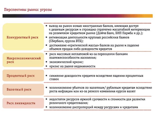 По соотношению розничных кредитов к ВВП Россия отстает от многих стран, поэтому потенциал роста велик. Согласно прогнозам рынок потребительского кредитования в нашей стране продолжит развиваться быстрыми темпами: через два года кредитами будут пользоваться уже 30–40% населения, а через пять-семь лет Россия по этому показателю достигнет уровня западных стран (80–90% населения).