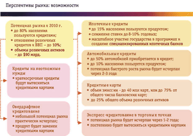 В настоящее время статистика выдачи банковских кредитов свидетельствует о том, что с 2003 г., то есть с начала развития розничного кредитования в России, доля ипотеки в общей структуре рынка кредитов фактически не изменилась. По состоянию на конец 2005 г. размер ипотечного рынка составил приблизительно $3 млрд. Для сравнения: на долю персональных кредитов в России приходится $29,5 млрд., общий объем автокредитов составляет $4,5 млрд., а потребительских кредитов — $3 млрд. Таким образом, на долю ипотечного кредитования приходится менее 10% общего объема розничного рынка.