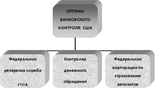 Финансовая система США является одной из наиболее жестко регулируемых как на федеральном уровне, так и на уровне штатов. Наиболее существенную роль в регулировании деятельности банков играют три органа представленные на рисунке 5.