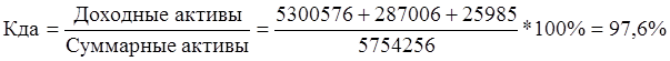 Уровень доходных активов (Кда) показывает, какую долю в активах занимают доходные активы. Так как практически все доходные активы являются рискованными, их высокая доля увеличивает неустойчивость банка и риски неплатежей как по текущим операциям, так и по своим обязательствам. Вместе с тем, размер доходных активов должен быть достаточен для безубыточной работы банка. Нормальным считается, если доля доходных активов составляет 65-70%, либо ниже, но при условии, что доходы превышают расходы.