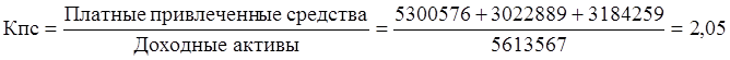 Коэффициент размещения платных средств (Кпс) показывает, какая доля платных привлеченных ресурсов направляется в доходные (платные) операции. Если коэффициент выше 1,0 это свидетельствует о том, что часть платных ресурсов используется не по назначению. Они отвлекаются либо на собственные нужды, либо в недоходные операции, что приводит к образованию убытков в банке. Однако, рассматривая данный коэффициент, необходимо учитывать, что в статье "платные привлеченные ресурсы" учитываются депозиты до востребования, которые являются бесплатным ресурсом для банка (либо начисляемые проценты на остатки по текущим и расчетным счетам невелики), поэтому допустимое значение для данного коэффициента может меняться в зависимости от объема средств, находящихся на расчетных и текущих счетах в банке. Платные привлеченные средства