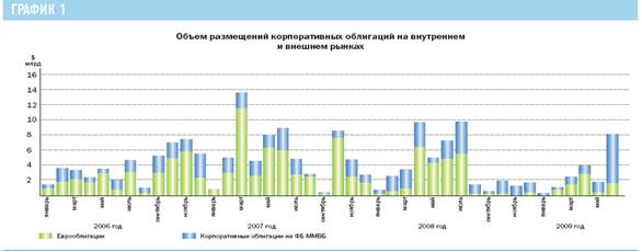 В конце весны - начале лета этого года заметно увеличился объем размещений корпоративных облигаций на первичном рынке. Так, если в марте, апреле и мае на внутреннем рынке он составлял $1-1,5 млрд. в месяц, то в июне достиг отметки в $6,6 млрд. - это максимальное значение за все время существования рынка (см. график 1).