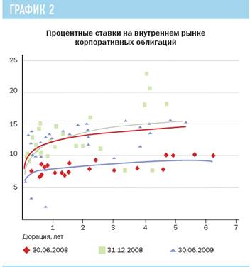Одним из наиболее заметных проявлений кризиса стал рост процентных ставок и их значительная сегментация по категориям заемщиков (см. график 2). Во втором полугодии 2008 года доходность облигаций "первого эшелона" выросла на внутреннем вторичном рынке с 6-9 до 10-18% годовых (для отдельных выпусков ставки поднялись еще выше), "второго эшелона" - с 8-12 до 20-30% годовых. Доходность облигаций "третьего эшелона" увеличилась еще больше. На конец 2008 года на внутреннем рынке около 110 выпусков торговалось с доходностью выше 100% годовых (это 17% от общего числа выпусков корпоративных облигаций, торгуемых на ФБ ММВБ).