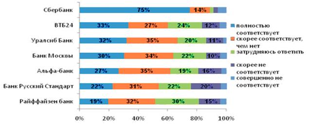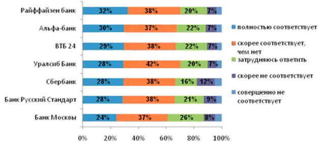 Исходя из данных регулярного исследования компании Profi Online Research «Мониторинг розничного рынка. Банки» эксперты определили видение россиянами некоторых составляющих имиджа ряда банков, оперирующих на отечественном рынке. Каждый банк оценивался клиентами, которые пользуются его услугами. По отношению к каждому утверждению респонденты могли выбрать один из 5 вариантов ответов, находящихся в радиусе от «полностью соответствует» до «совершенно не соответствует». [17]