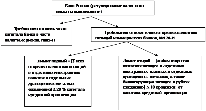 Рассматривая регулирование валютного риска на макроуровне, со стороны ЦБ РФ, было отмечено, что законодательное регулирование валютного риска на уровне банковской системы в целом и на уровне отдельных коммерческих банков в частности осуществляется по двум направлениям (рис. 3). Контролируя валютный риск при расчете капитала банка, ЦБ РФ также лимитирует открытые валютные позиции.