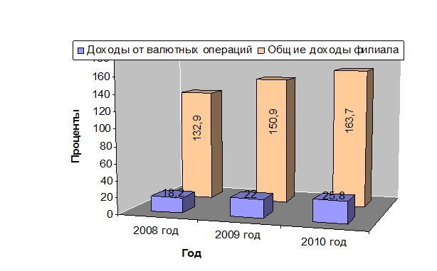 В 2010 году доходы от валютных операций составили 18,2 млн.долл., что составило 13,7% от общей суммы доходов, в 2009 году доходы от валютных операций выросли на 3,8 млн. долл. и составили 22 млн. долл., что составило 14,6% общей суммы доходов. Это наглядно изображено на рис. 7.