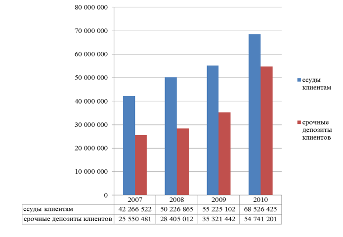 В целом акцент по размещению активов продолжал смещаться в сторону увеличения доли активных операций с клиентами и, в первую очередь, кредитования. Кредитные вложения на конец 2010 года значительно возросли и составили 113 610 541 тыс. тенге. Диаграмма, отражающая эти изменения, представлена на рисунке 11.