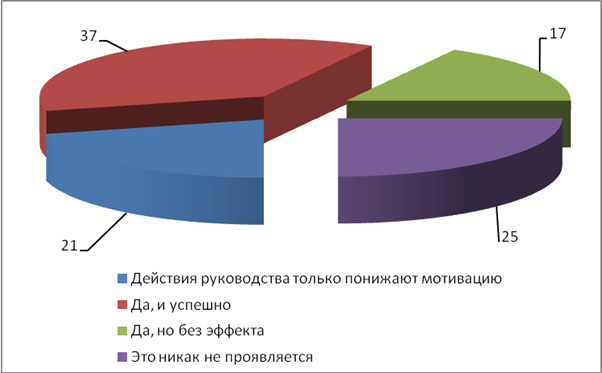 Таким образом, можно констатировать высокий уровень недовольства действиями руководства: 46% сотрудников утверждают, что меры по повышению мотивированности не предпринимаются, либо абсолютно некорректны. При этом 17% сотрудников считают их безрезультатными. И 37% считают действия со стороны руководства успешными.