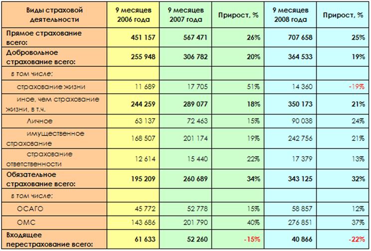 Таким образом, за первые 9 месяцев 2008 г. ключевыми факторами роста российского страхового рынка стало возрастающее потребление физических лиц, в первую очередь за счет заемных средств. Это вызвало увеличение страхования «кредитной жизни», автокаско физлиц, равно как и страхование других объектов залога (в первую очередь, ипотеки), а также рост сборов по ОСАГО. Помимо этого, наблюдался ренессанс псевдостраховых операций по корпоративному ДМС.