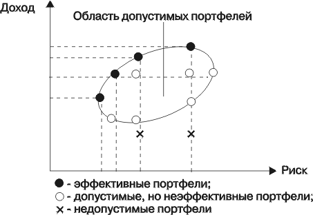 Рис.1. Недопустимые, допустимые и эффективные портфели