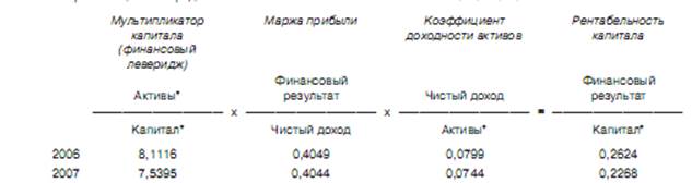 Кроме того, анализ факторов, повлиявших на снижение показателя рентабельности капитала в 2007 году, показывает, что оно произошло при сокращении величины финансового левериджа (мультипликатора капитала). Показатели маржи прибыли и доходности активов по сравнению с 2006 годом изменились не значительно, что свидетельствует о достаточно эффективной работе банков в 2007 году. На снижение уровня финансового левериджа оказал влияние опережающий рост собственных средств (капитала) по сравнению с активами банковского сектора, во многом благодаря публичному размещению акций Сбербанка России ОАО и ОАО Банк ВТБ.