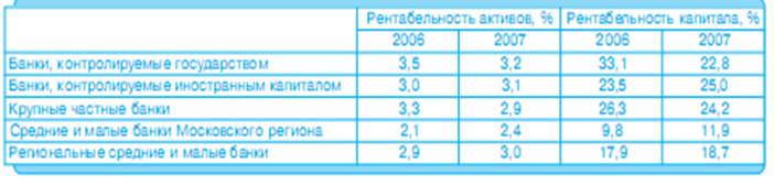 В 2007 году показатели рентабельности у банков, контролируемых иностранным капиталом, были одними из наиболее высоких в банковском секторе. У банков, контролируемых государством, и крупных частных банков они находятся на уровне, близком к средним показателям по банковскому сектору. Региональные средние и малые банки по показателям рентабельности продолжают существенно опережать средние и малые банки Московского региона. При этом уровень рентабельности последних остается самым низким по сравнению с другими группами.