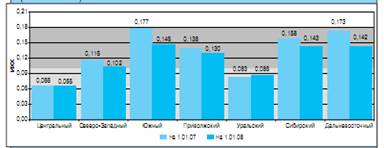В 2007 году значение ИХХ по активам в федеральных округах не выходит за пределы среднего уровня концентрации (см. ри.4).