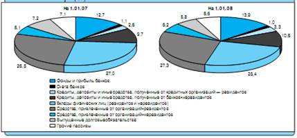 В структуре средств, привлеченных от организаций, на 1.01.2008 немногим менее 47% занимают остатки на расчетных и прочих счетах (то есть краткосрочные ресурсы), которые выросли за год на 34,3%. На них приходилось 15,7% пассивов банковского сектора (на 1.01.2007— 16,8%).