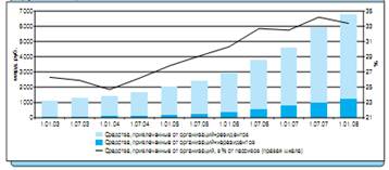 В 2007 году в структуре средств, привлеченных от организаций, опережающими темпами росли депозиты организаций: темп прироста их объема составил 67,5% (в 2006 году — 64,8%), а доля в совокупных пассивах банковского сектора выросла с 11,0 до 12,8%. В пределах данного источника объем депозитов со сроками привлечения свыше 1 года увеличился на 90,2%, на 1.01.2008 на них приходилось 33,7% общего объема депозитов организаций (на 1.01.2007— 29,7%).
