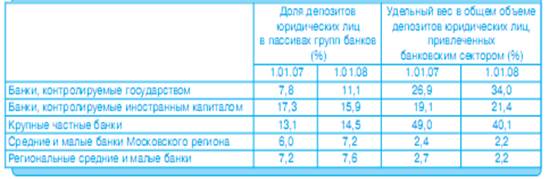 Наибольший рост объема привлеченных депозитов организаций отмечен у банков с государственным участием и банков, контролируемых иностранным капиталом. Продолжает увеличиваться, хотя и более медленными темпами, объем привлеченных депозитов юридических лиц у крупных частных банков. Основные факторы роста привлеченных депозитов юридических лиц у данных групп банков— это высокий уровень доверия клиентов к крупным банкам, а также более широкий спектр оказываемых этими банками услуг.